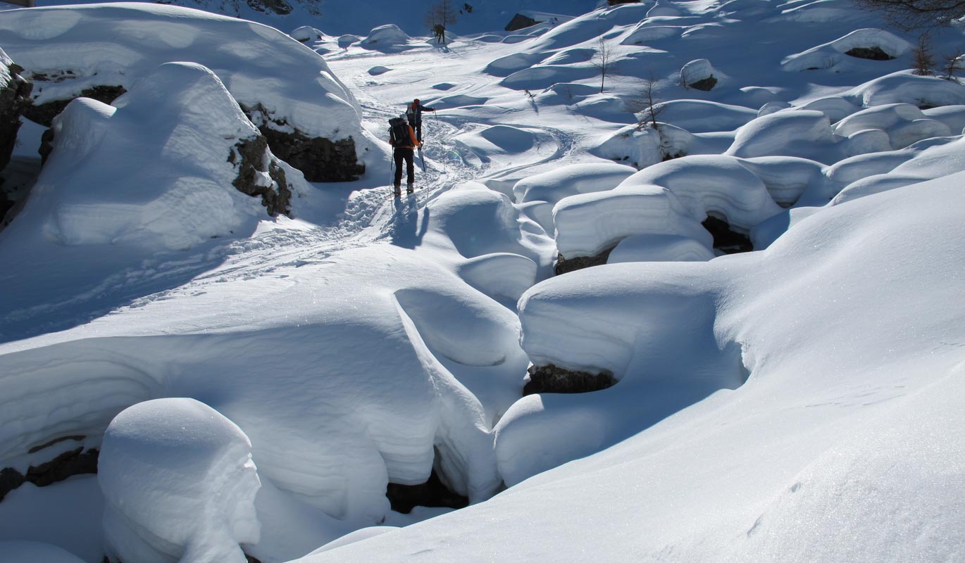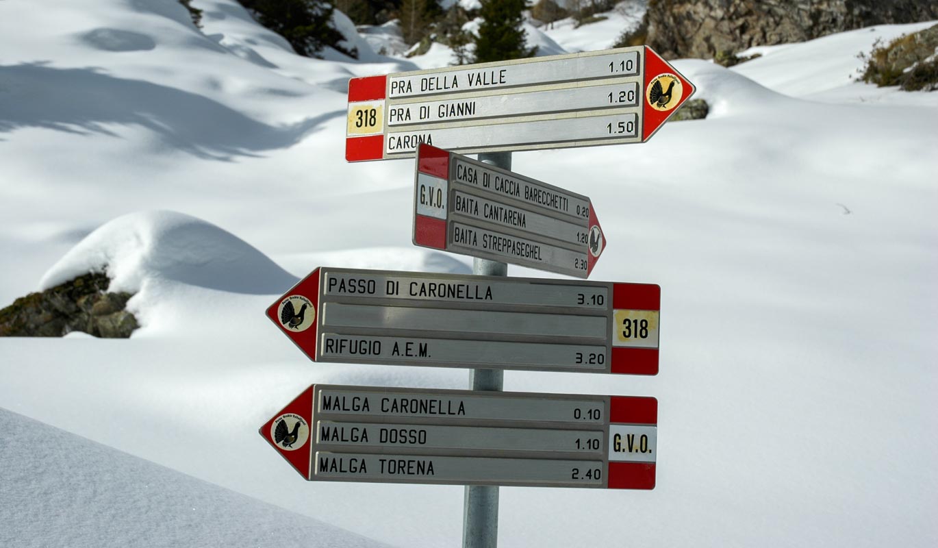 Procedendo a piedi, attraversati i vasti prati delle Baite Involt e di Ronco, si raggiungono le baite di Prà Gianni e di Prà della Valle. Da qui è possibile osservare le cascate alimentate dal torrente Caronella (1.518 m.), meta di appassionati di arrampicata su ghiaccio. Dopo un percorso tra massi erratici la strada cede il posto a un sentiero che si snoda in un paesaggio tipicamente alpino, sovrastato dalle maestose cime delle Orobie.