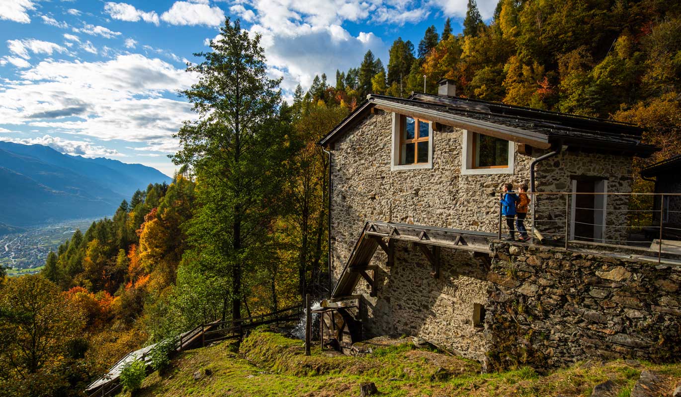 Questo semplice e piacevole itinerario permette di ammirare le chiese di Santa Maria di Ligone e di San Rocco: d’impianto seicentesco e con i relativi ossari, sono tra le più belle espressioni dell’arte sacra locale. Dall’abitato di Teglio si seguono le indicazioni per Prato Valentino. Costeggiando pascoli e prati fioriti, si raggiunge Ligone, una delle più antiche e pittoresche contrade del territorio tellino, dov’è possibile visitare la chiesa di Santa Maria. Si prosegue, quindi, su una strada sterrata con vista panoramica sulla catena delle Orobie e sulla Val Malgina. Dopo una breve discesa, oltrepassati gli alberi di castagno, la strada piega verso sinistra fino a San Rocco e alla sua omonima chiesa. Sul tornante asfaltato si può quindi prendere il tracciato sulla destra e arrivare fino alla zona dei mulini.