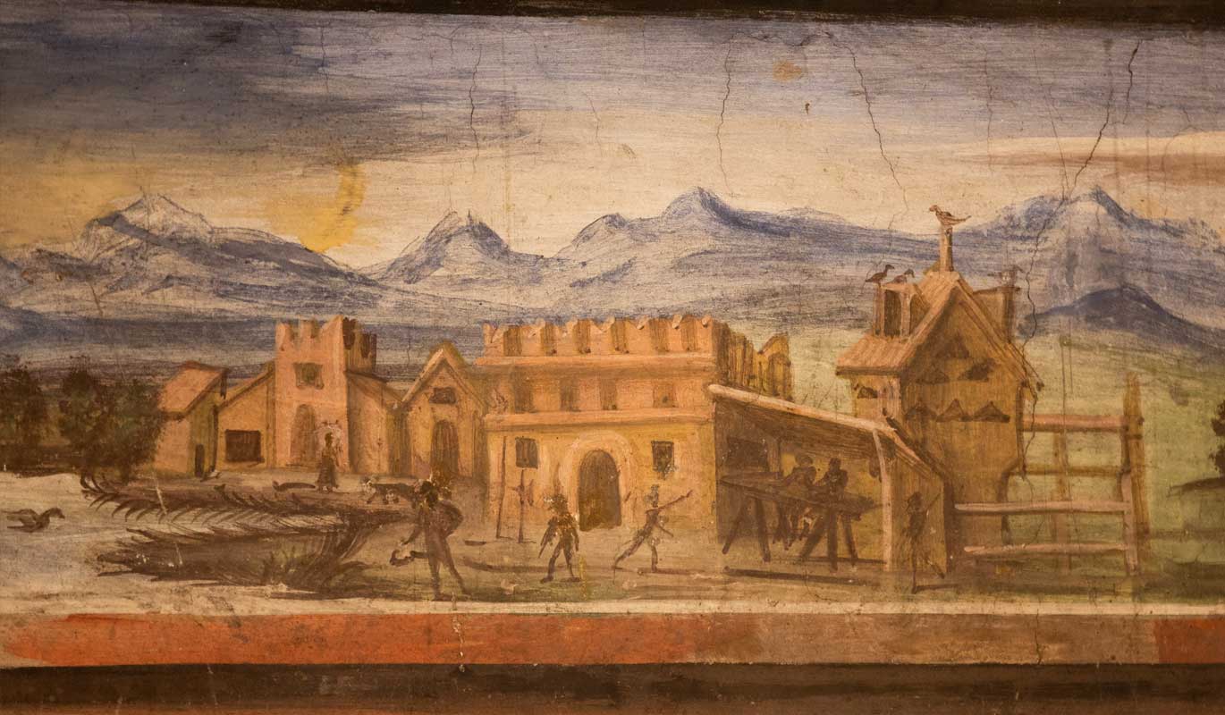 The large Renaissance Palazzo was built by the wealthy Guicciardi family, originally from Ponte in Valtellina. The dwelling, currently divided into two properties, has been partially restructured. The restored interiors are evidence of the refined taste of those who lived there in the 16th century. The hall on the ground floor, with coffered ceiling, was frescoed by Fermo Stella with heraldic coats of arms and exquisite views. The adjacent room, on the other hand, is characterised by a marble fireplace adorned with sculptures and coats of arms of the Besta, Guicciardi and Gatti families. Present in the as yet unrestored wing are two well preserved stüe, typical rooms covered in Arolla pine wood and with a stove fitted. A curiosity: written words are visible on the wall of the façade of the Palazzo with sketches of knights in armour from the 17th century bearing the name Bellamira, which was once given to the road. This location, in fact, was chosen as the residence of the wealthiest families of Teglio due to its privileged position on the Orobie.