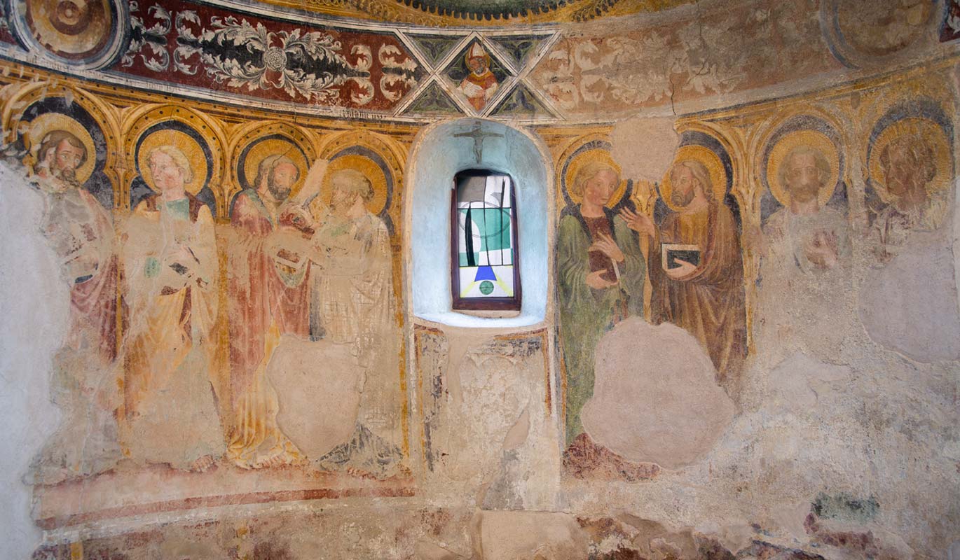 The church of San Pietro [St. Peter’s], built in the 11th century, is just a few yards from the centre of Teglio. It has Romanesque architecture in the style of Como and the Ticino, consisting of square blocks of stone and river pebble stones set in mortar. The single aisle terminates in an apse of pilaster strips and Lombard bands, while the bell tower is characterised by three orders of two-arched mullioned windows. In 1537 the church came into the possession of the Protestants, who cancelled out all the pictorial decorations with mortar and plaster for reasons of worship, and these were only rediscovered and restored in the 1980s. The interior, although very bare, in fact conserves, in the apsidal bowl, late fourteenth-century frescos in which the figure of the Christ Pantocrator dominates, surrounded by the symbols of the evangelists and the figures of the apostles. Frescoed scenes, unfortunately damaged and not easy to interpret, are also present on one wall of the aisle.