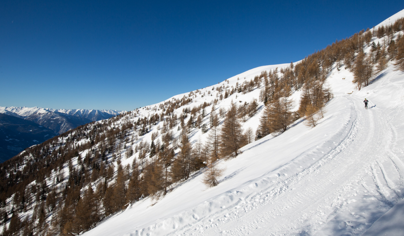 The itinerary starts east of the Prato Valentino ski area and enables lovers of classic ski mountaineering to safely arrive in the proximity of the slopes for the descent.